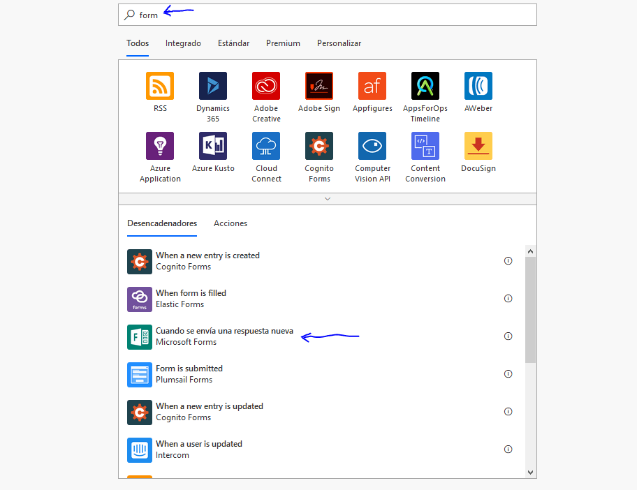 - Damos en crear un nuevo paso y filtramos de nuevo con «Form» para encontrar la opción «Obtener detalles de la respuesta», En id del formulario seleccionamos nuestro formulario y despues en is de las respuestas seleccionamos «Lista de notificaciones».